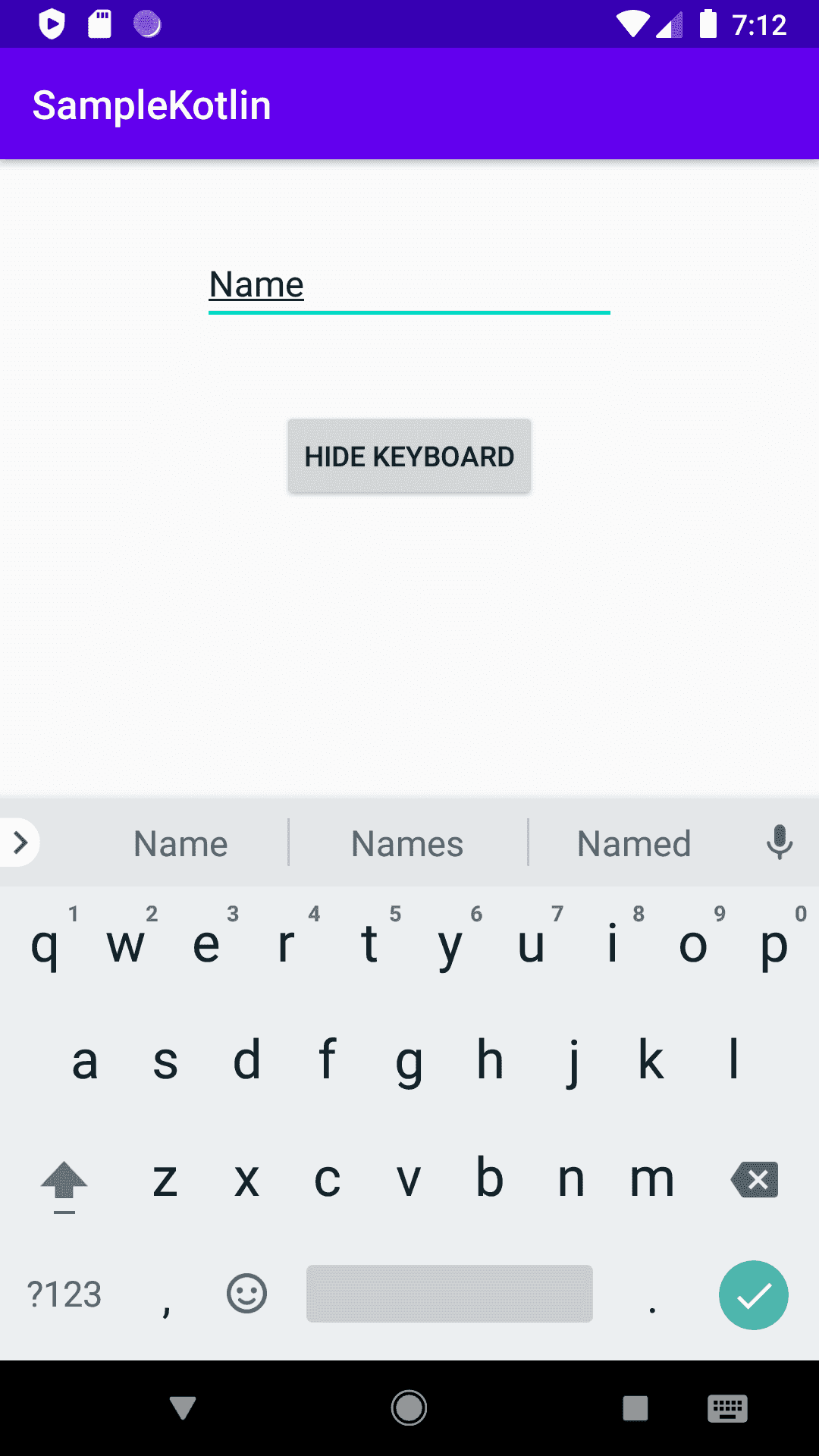 If you click on the EditText that is showing ‘Name’ will pop up the keyboard. Now, we will add one click listener to this button that will hide the keyboard.