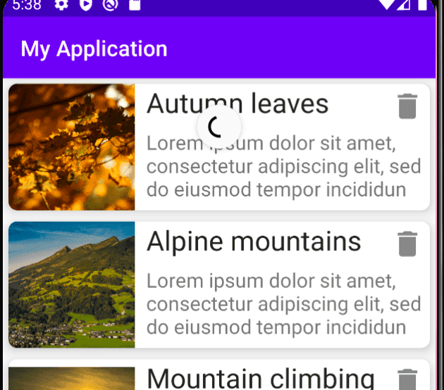 private lateinit var swipeRefresh: SwipeRefreshLayout- In the xml file of ActivityMain, i.e. activity_main.xml, add SwipeRefreshLayout component above RecyclerView in the ConstraintLayout :