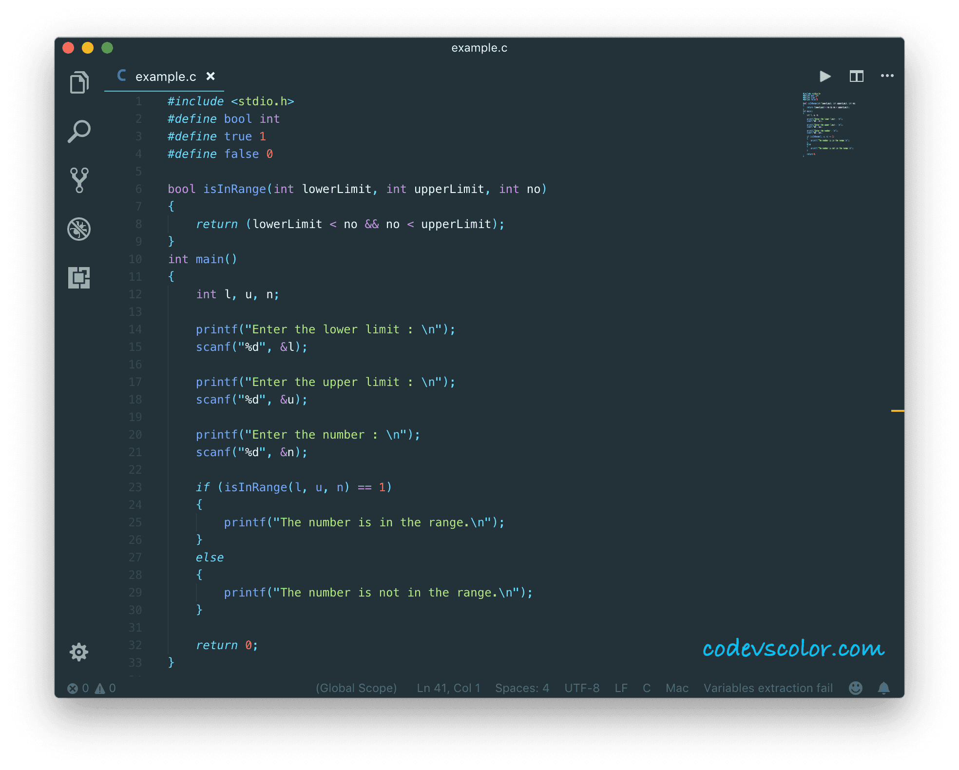In this C programming tutorial, we will learn how to check if a number is in a range or not using only one comparison line. The program will take all inputs from the user (number, lower range and upper range) and check if it lies in the range.