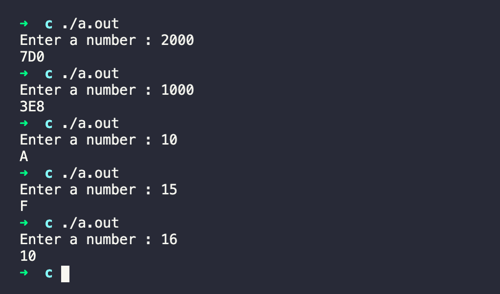 So, we need to keep dividing a number by 16 to convert it from decimal to hexadecimal. But in C, we will have to store the result in an character array because the result can be a number or character.