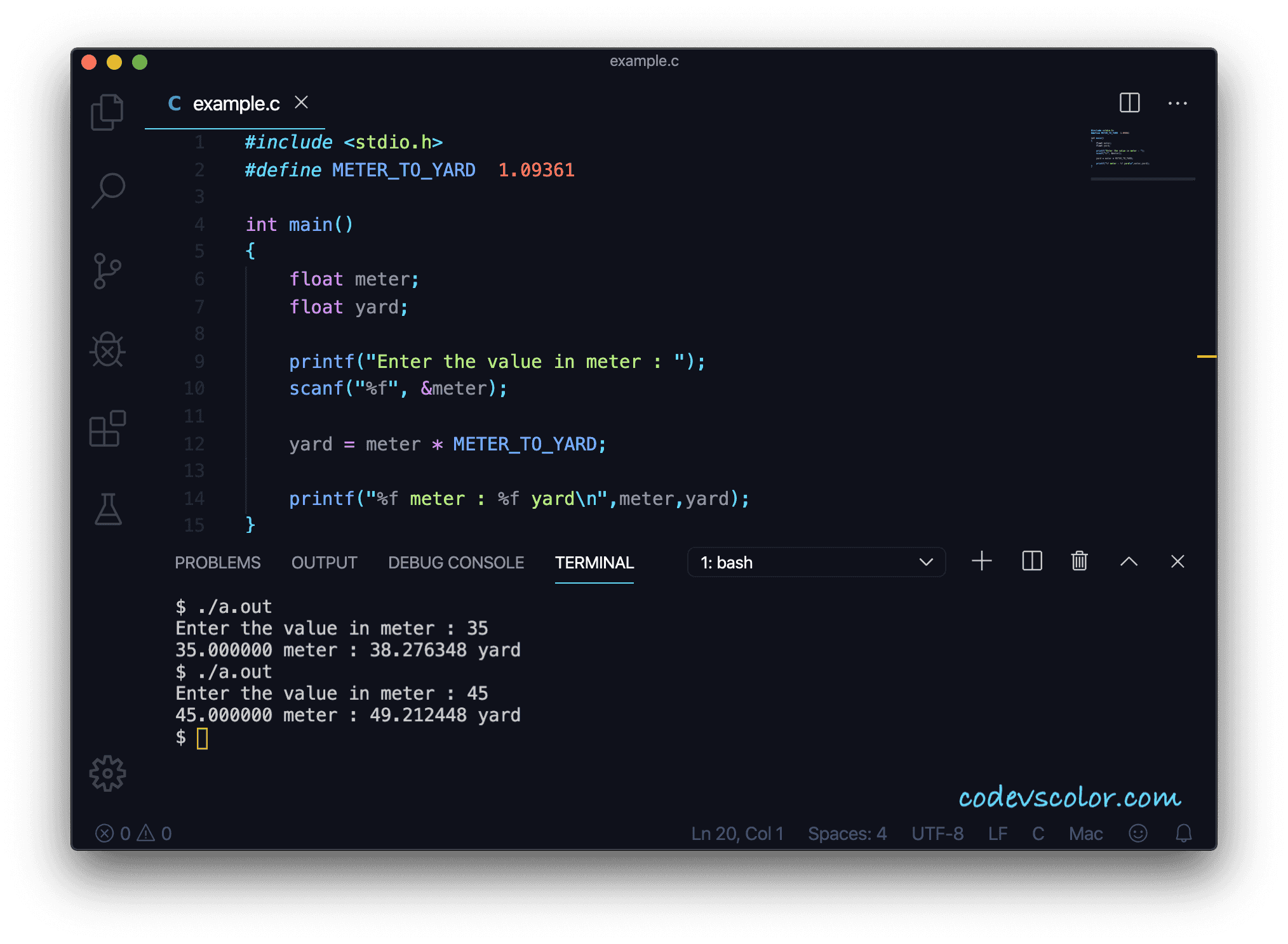 In this tutorial, I will show you how to convert one value in meter into yard using C programming language. I will write one simple program, that will take the meter value as input, convert it to yard and print it to the user.