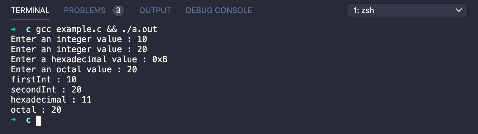 - The third printf prints the decimal value of octal, which is 16, decimal representation of octal value 20.
