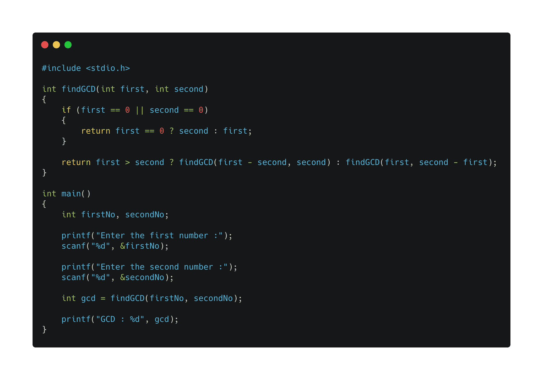 int gcd = findGCD(firstNo, secondNo);