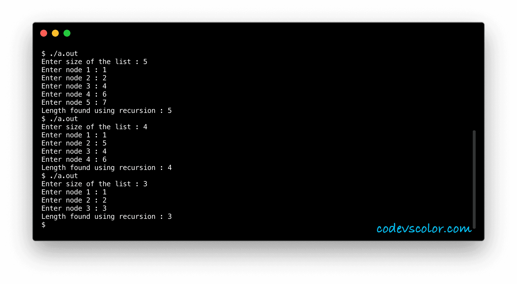 printf("Length found using recursion : %d \n", getLength(headNode, 0));