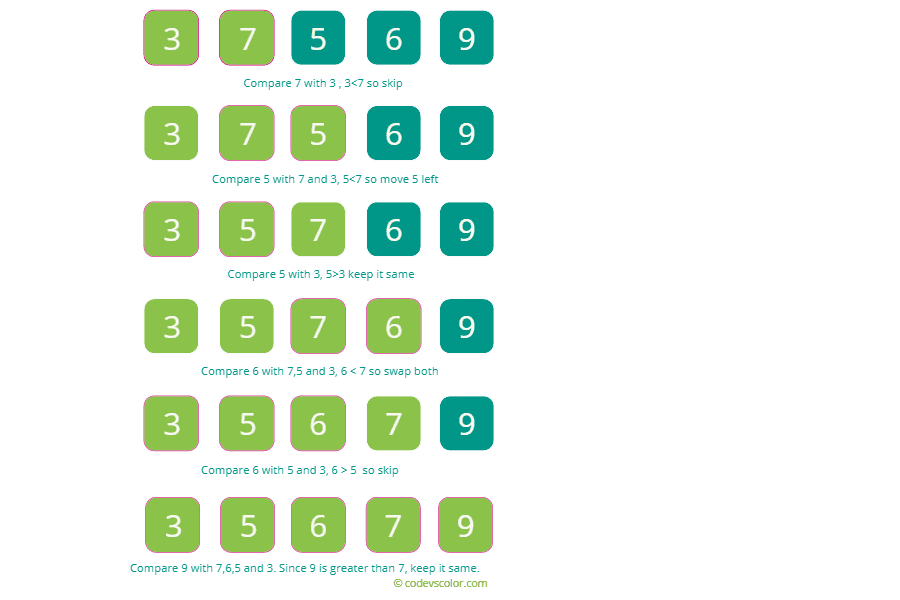 - Now for third element 5, compare it with all left elements. Since, 7>5, swap it. Again 5>3 so keep it same.