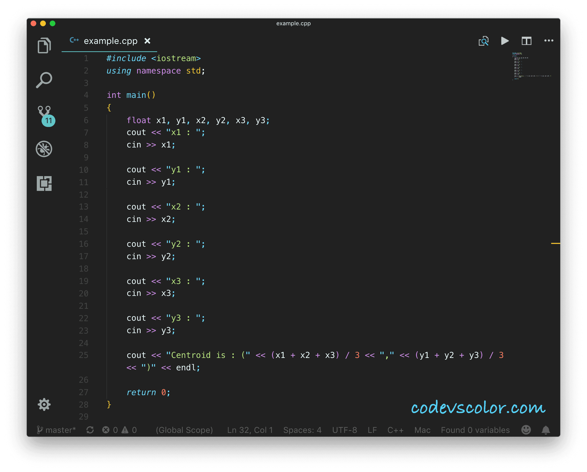 In this C++ programming tutorial, we will learn how to find the centroid of a triangle. The program will take the vertices as input from the user. It will find the centroid and print it out.
