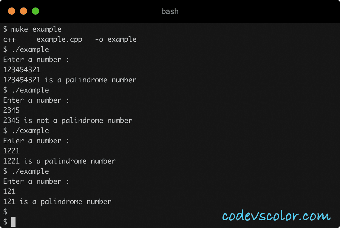 In this tutorial, we will learn how to check if a number is a palindrome or not in C++. The program will take the number as input from the user, find out if it is palindrome or not and print out one message to the user.