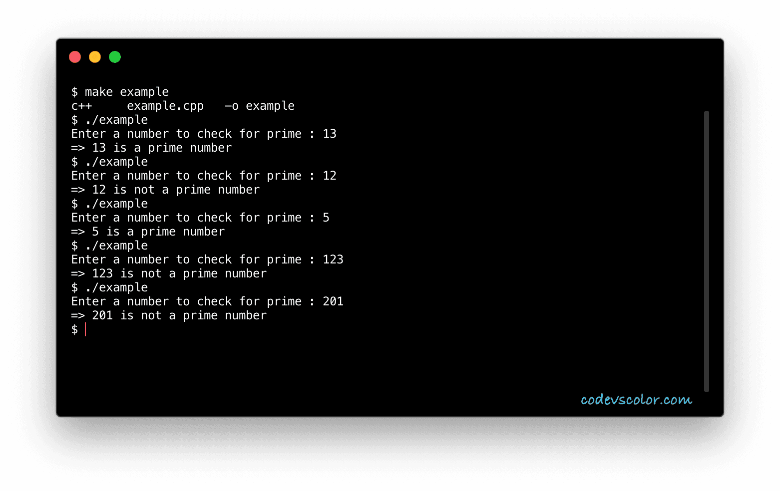 This tutorial will show you how to verify if a number is prime or not in C++ programmatically. The program will ask the user to enter a number, it will check if it is prime or not and print out the result.