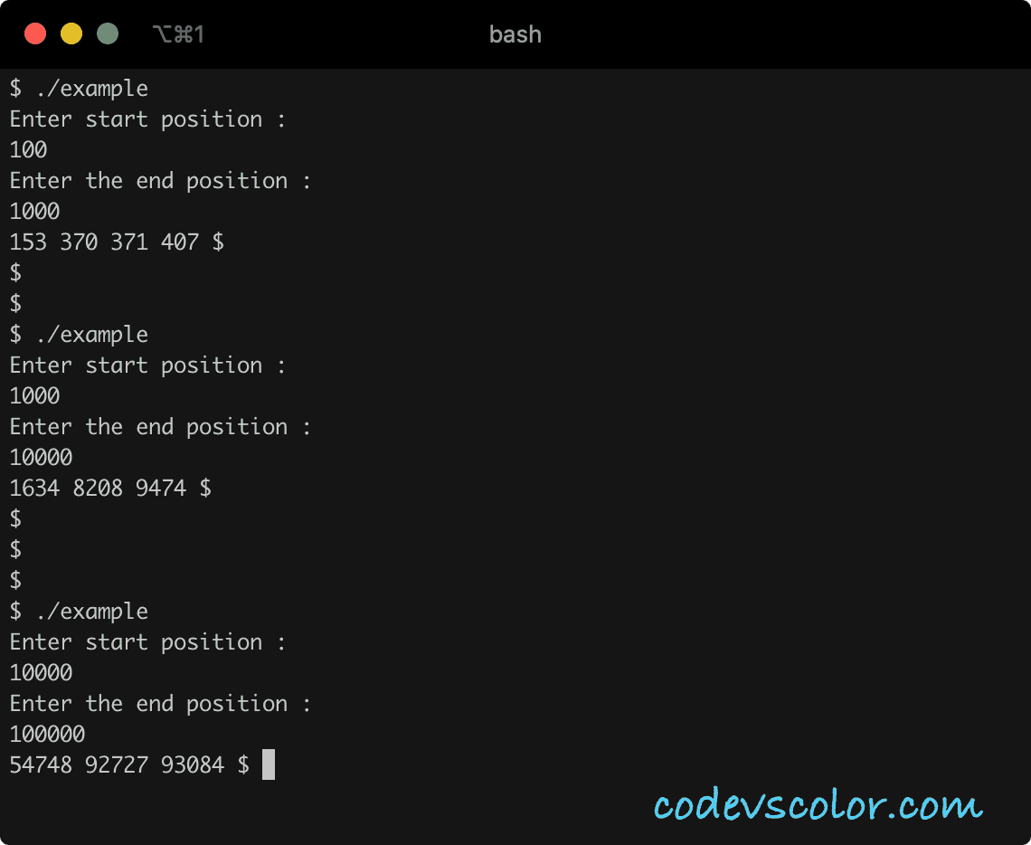 In this post, we will learn how to find all Armstrong numbers in a range using C++, i.e. the user will provide the start and end position and the program will find out all numbers within these positions.