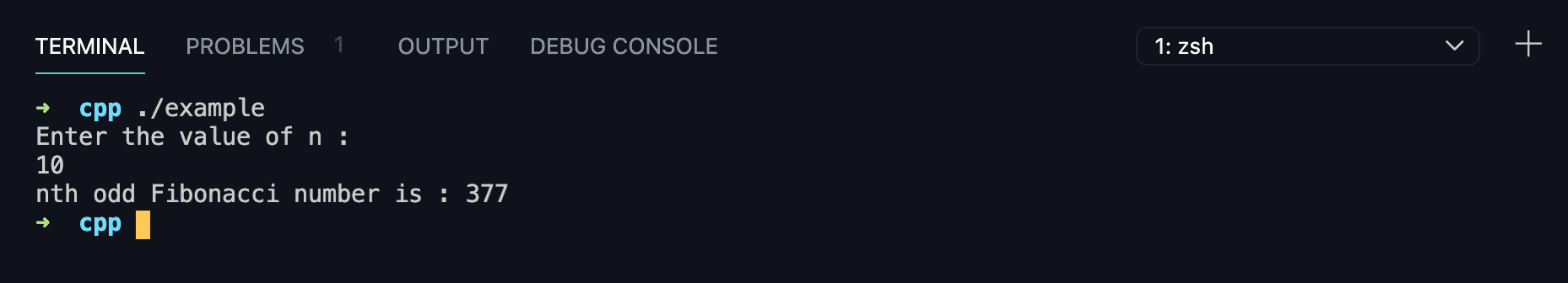 cout << "nth odd Fibonacci number is : " << getNthOddFibonacci(n) << endl;