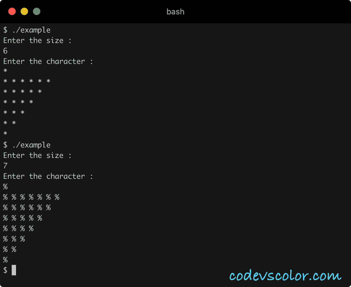 Inside printInvertedTriangle, we are using two for loops. The outer loop denotes the current line. It runs for size amount of time. The inner will run from j = size to j = i. Inside this inner loop, print the value of the character c that is passed to printInvertedTriangle.