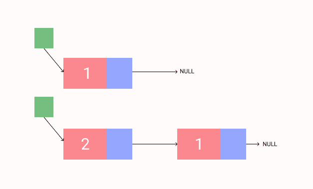 At first, the head is pointed to 1. Once we insert 2, it pushed 1 to right and 2 is added to the front with head pointed to 2.