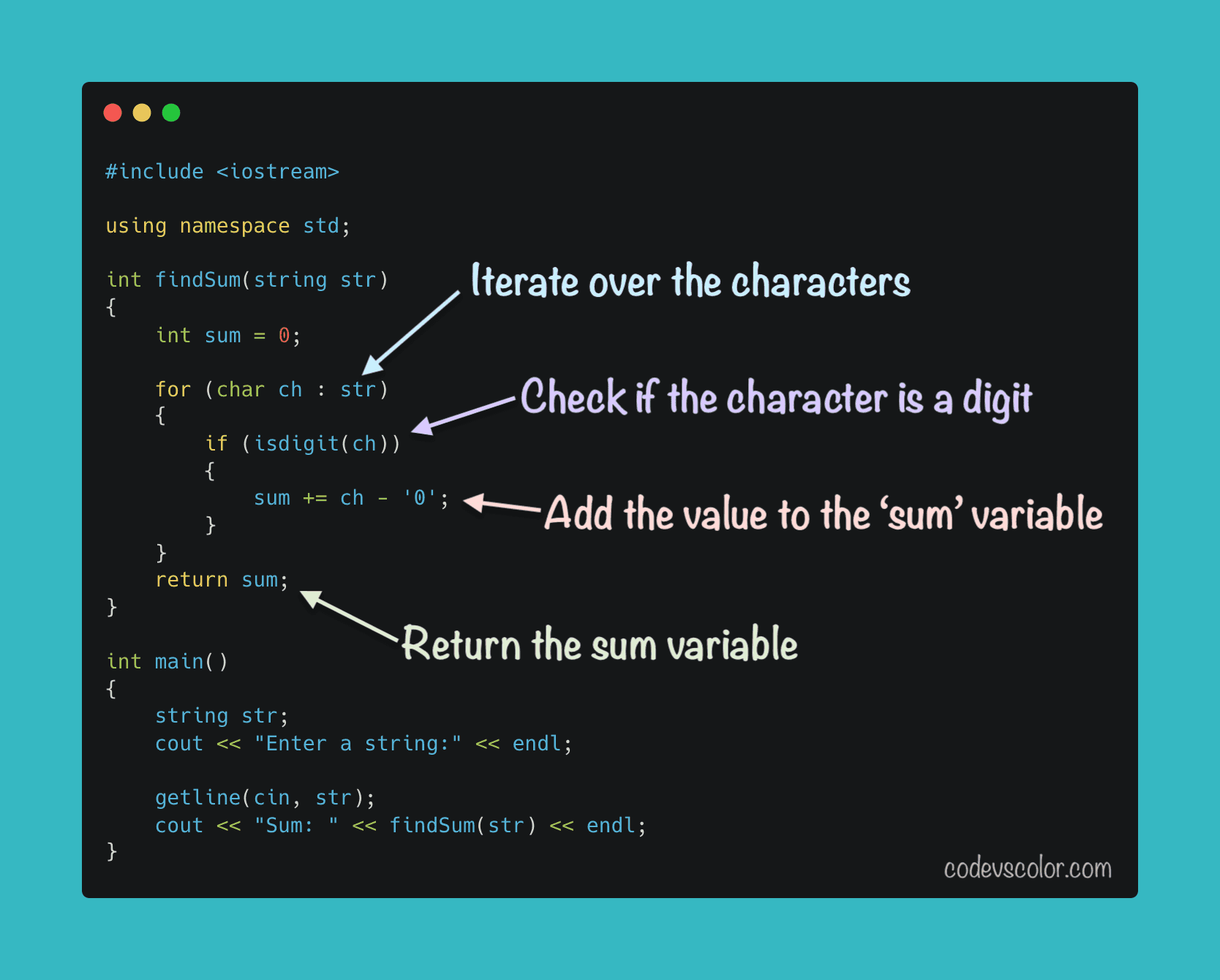 - Check if the current character is a digit or not. If it is a digit, add it to a sum variable.