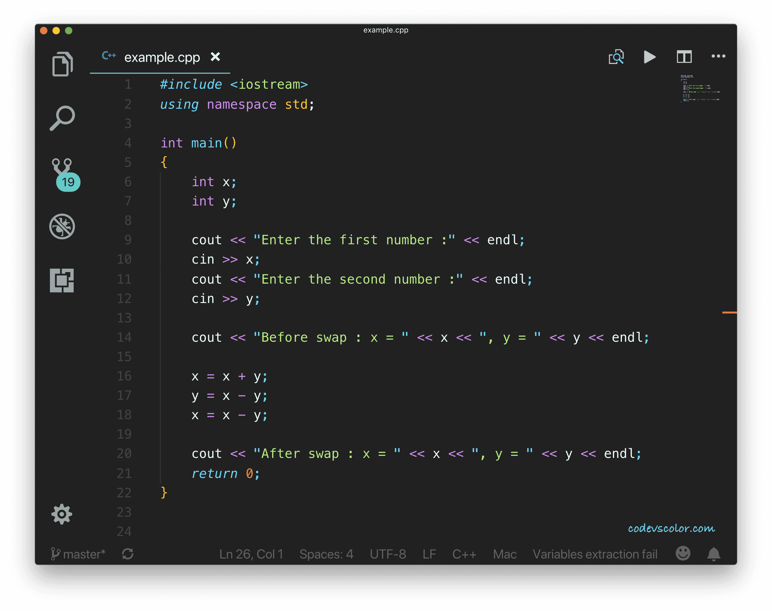 In this C++ example tutorial, we will learn how to swap two numbers without using a third variable. This question is asked in most beginner level interview and you can use the same logic for any programming language.