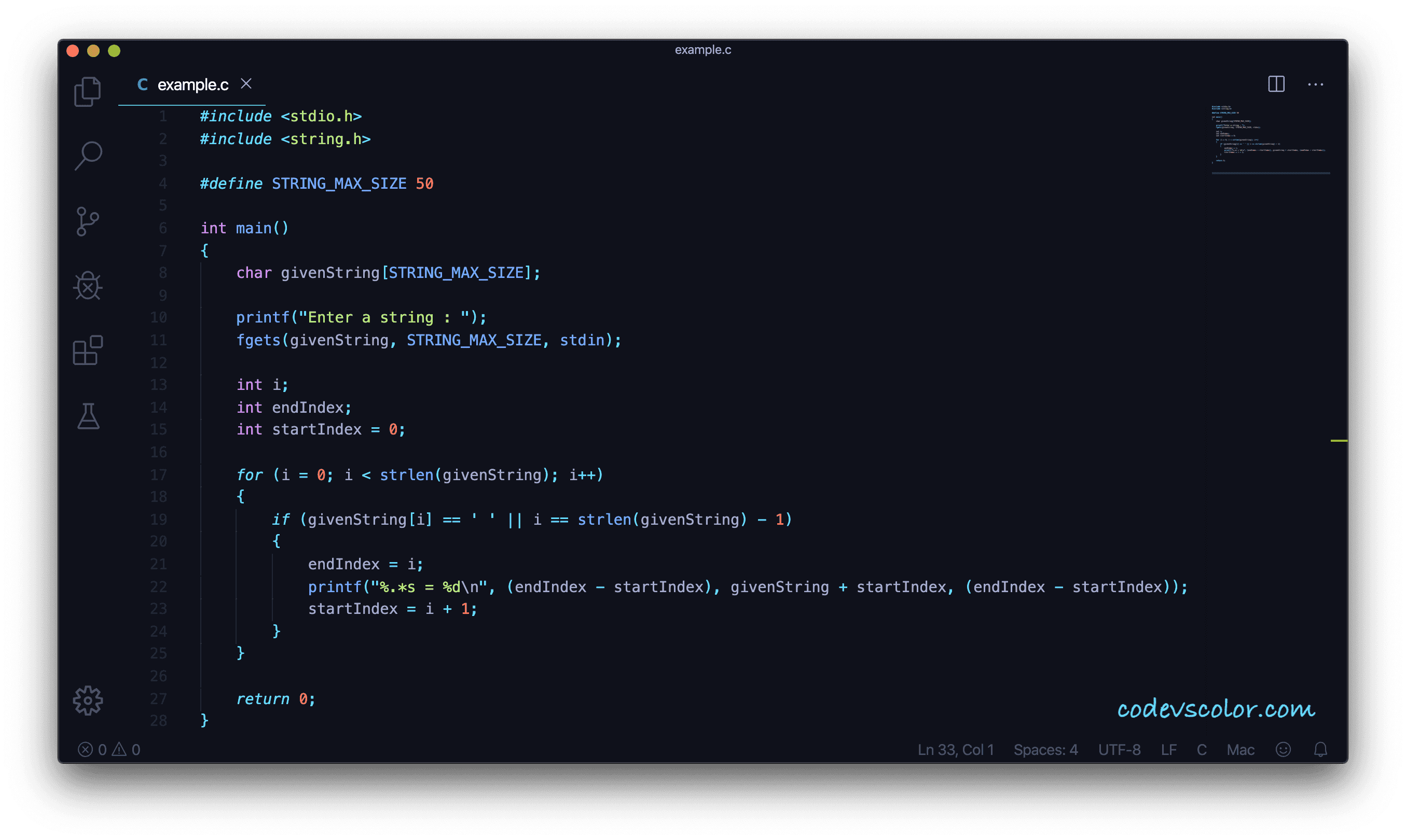 In this tutorial, we will learn how to print the length of each words in a string in C. Our program will take one string as input from the user and print out each word with its length. This program will give you an idea on how to read user input string, how to iterate through the characters of that string and how to print one substring of that string.