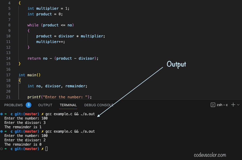In this tutorial, we will learn how to find the remainder without using the modulo operator, % in C programming language. We will learn three different ways to find the remainder in C.