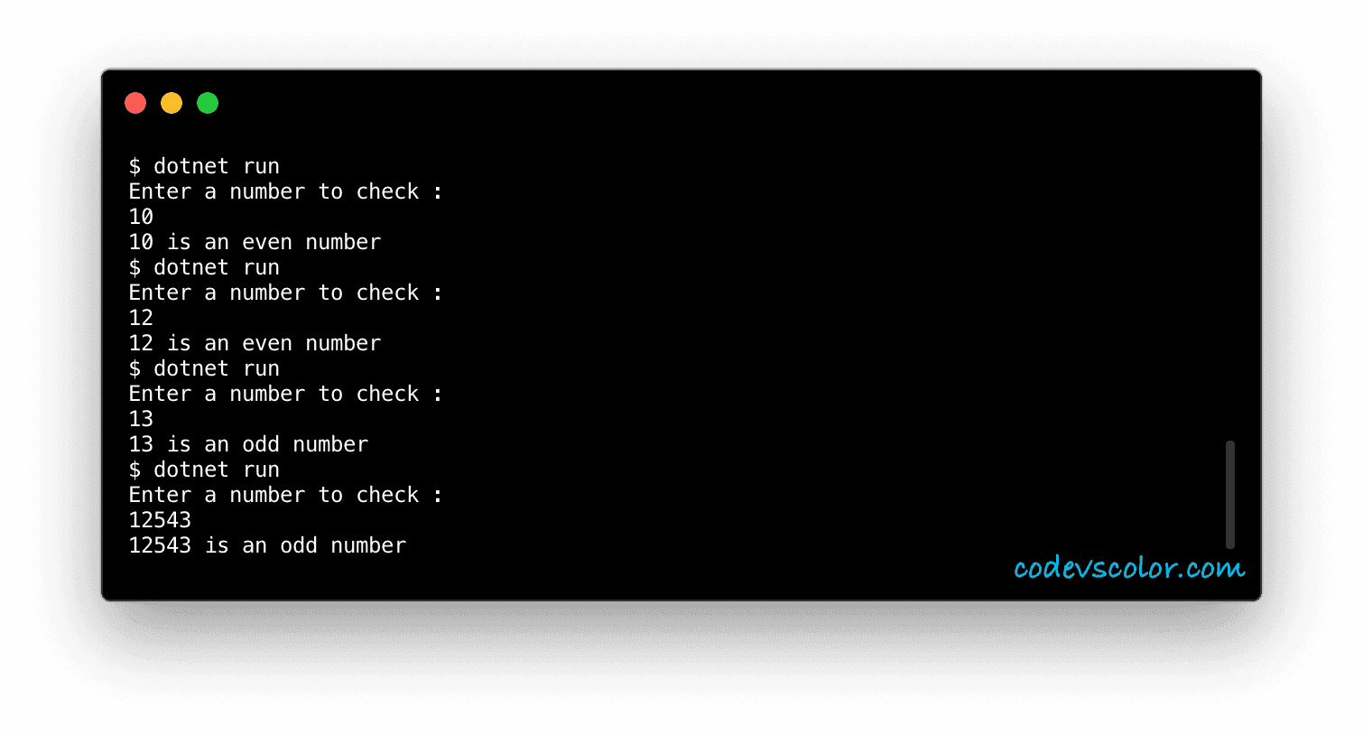 In this tutorial, we will learn how to check if a number is even or odd using C#. The program will take the number as input from the user and print out the result i.e. it will print if the number is even or odd.