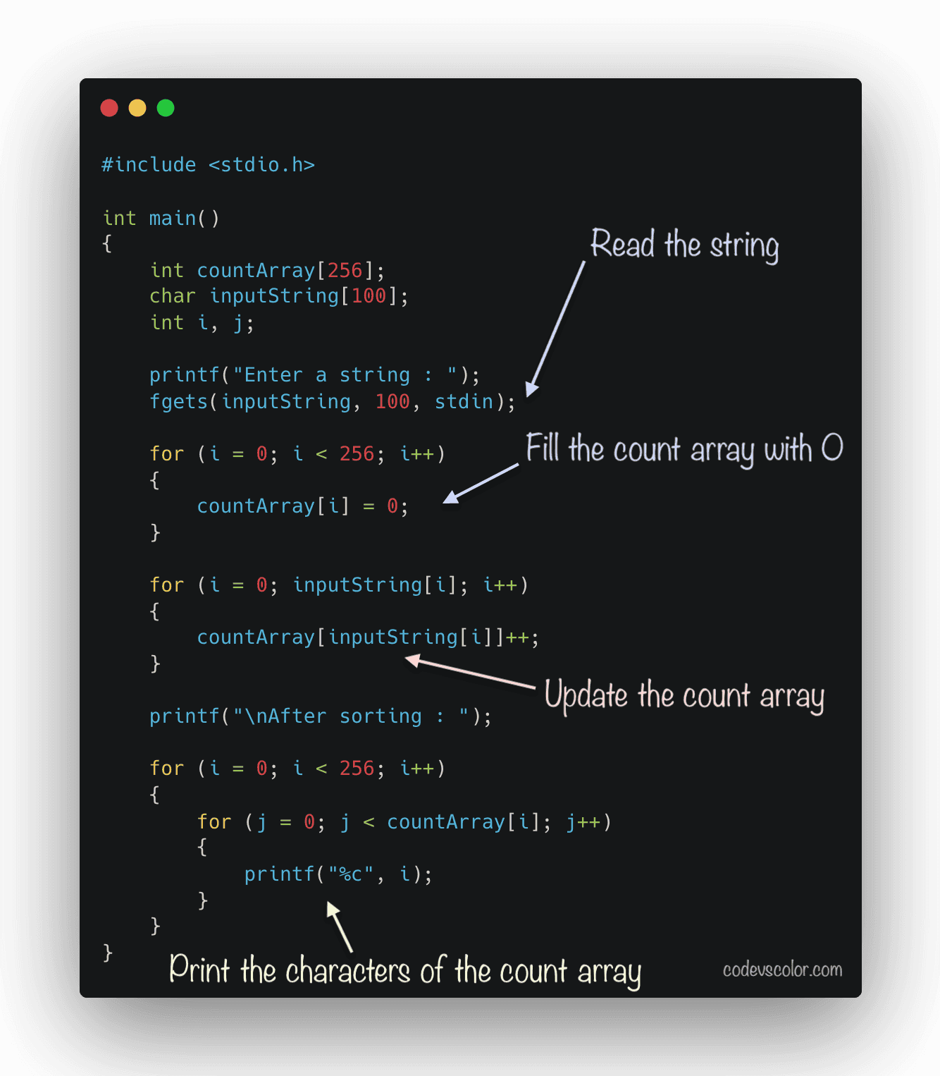 countArrayfor the ASCII value position by 1. The statementcountArray[inputString[i]]++is used to increment the value at index positioninputString[i]which is equal to the ASCII value of the character at positioniof the stringinputString. - Print the final sorted string.