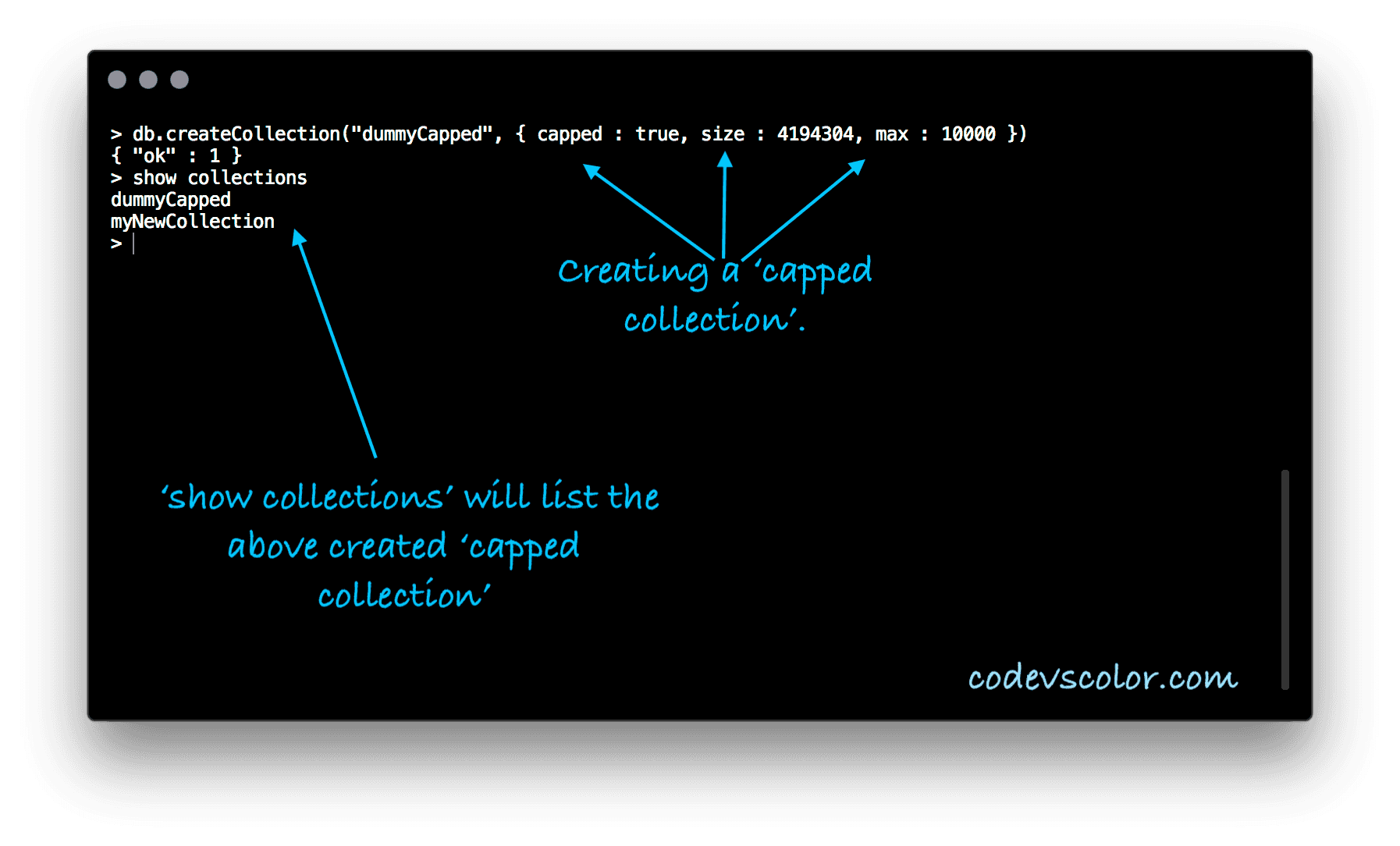 You can think capped collections like a circular buffer. It has fixed size. If the size is exceed, it will replace old documents automatically. Let’s create one capped collection :