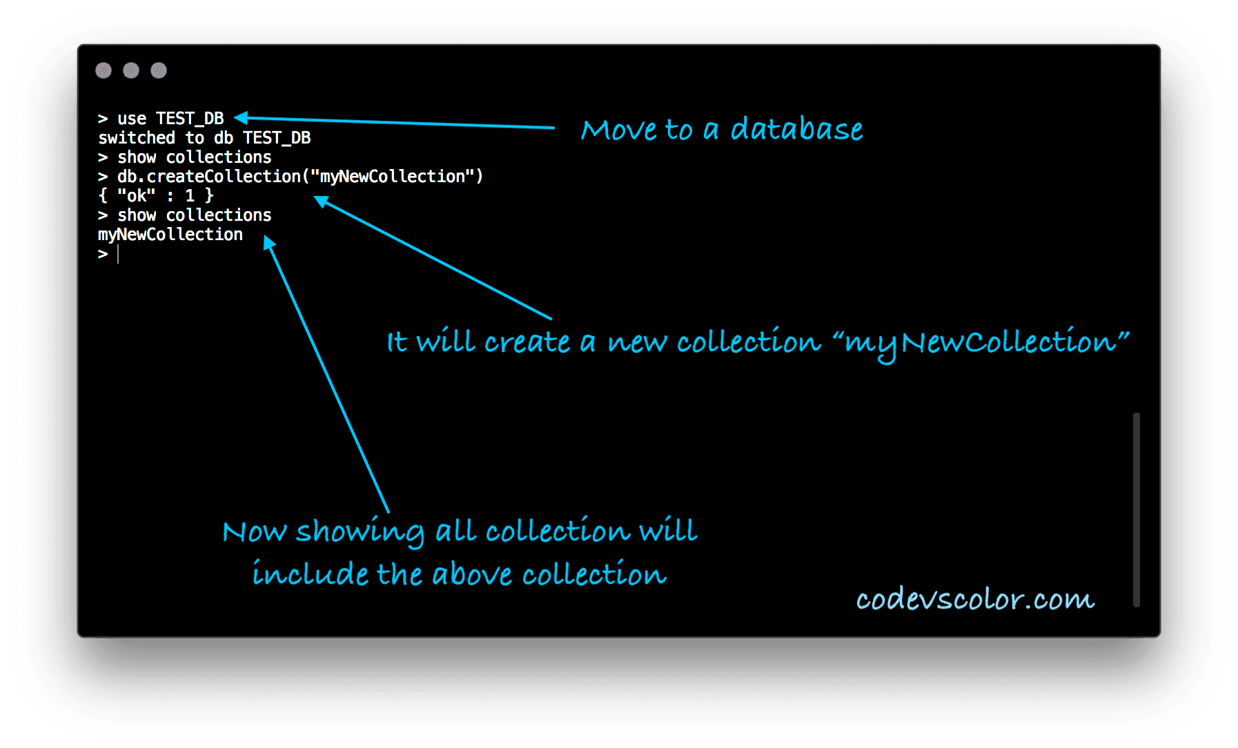 Let’s create one simple collection. Run the following command to create a collection of name “myNewCollection” :