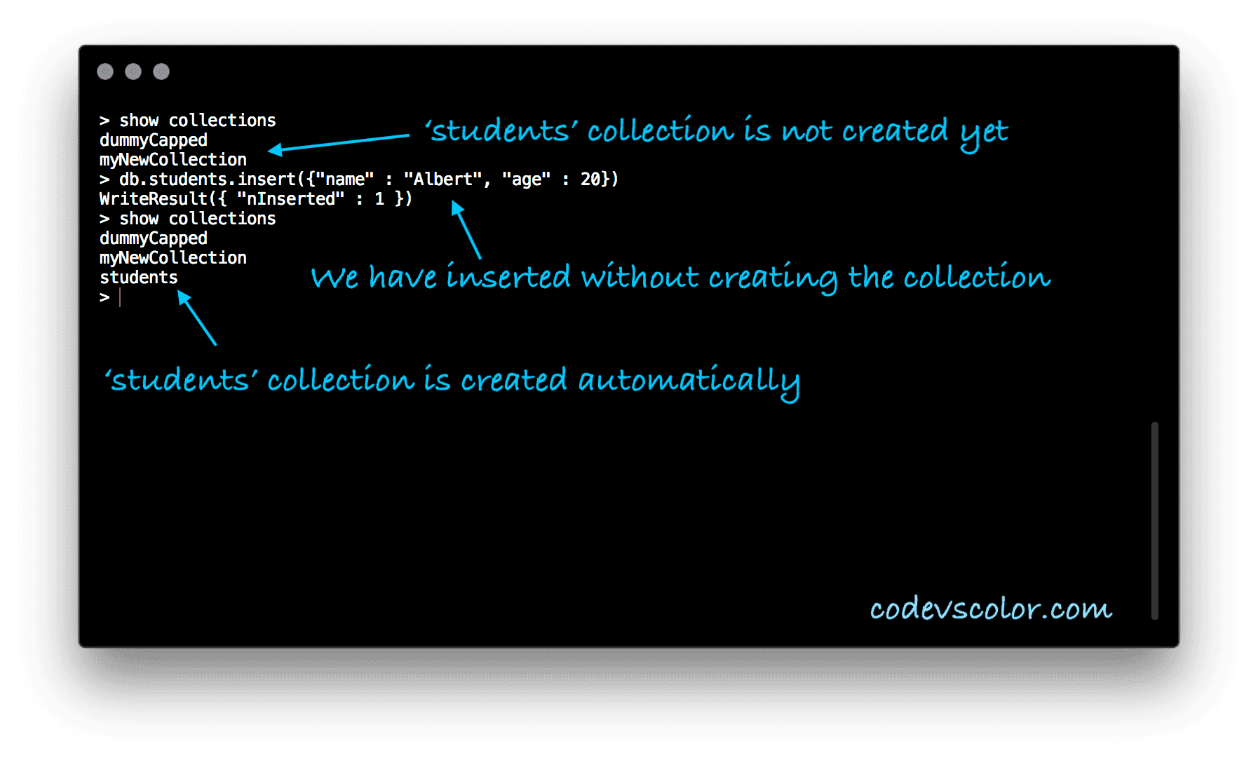 In MongoDB, we can insert document without creating a collection. If you insert documents to a collection that is not previously created, it will be created automatically. For example , if students collection is not created and you will insert a document to this collection, MongoDB will create it automatically.