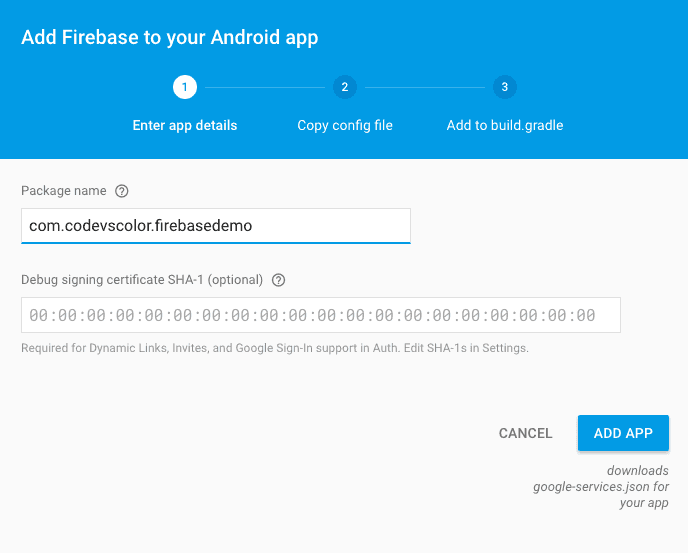 4. Enter your application package name (in my case it is com.codevscolor.firebasedemo) and click** “Add App”**