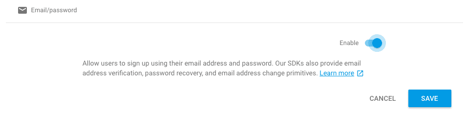 7. Click on “Auth” -> Click on “Sign-In Method” -> “Email/Password” and set it enabled.