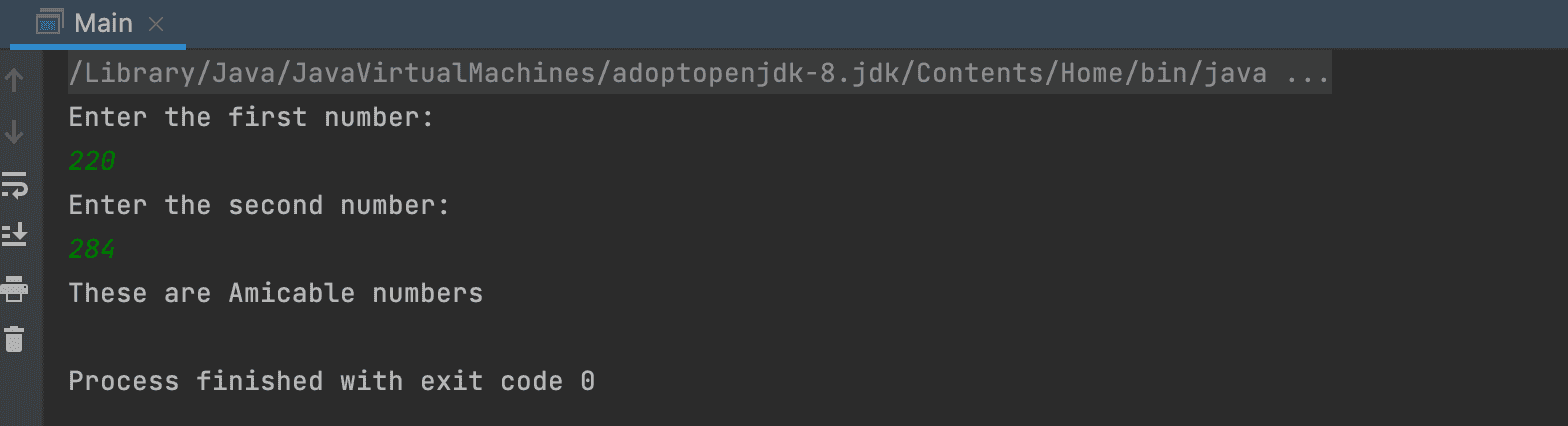 - The last if-else statement checks if the sum of divisors of the first number is equal to the second number and the sum of divisors of the second number is equal to the first number or not. If yes, it prints that these are Amicable numbers. Else, it prints that these are not Amicable numbers.