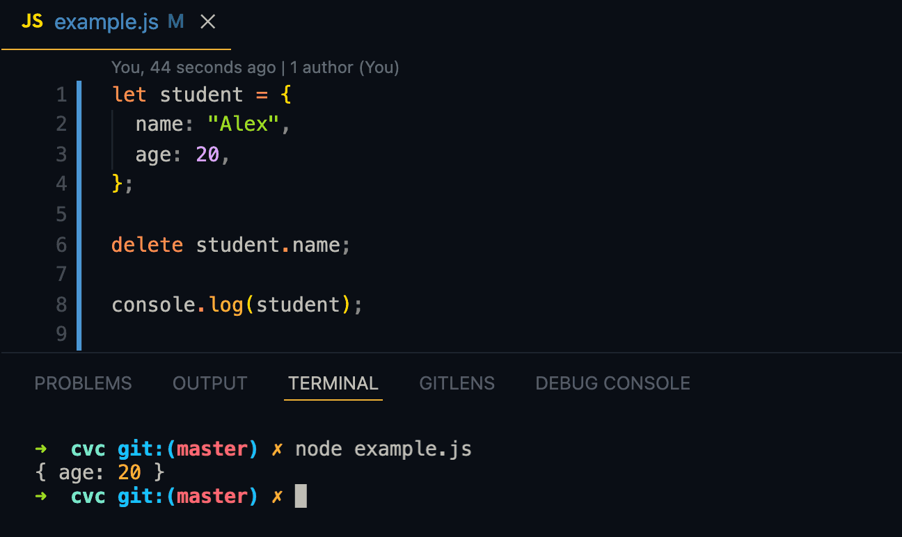 console.log(student);student object has two properties and we removed one with key name. It will print: