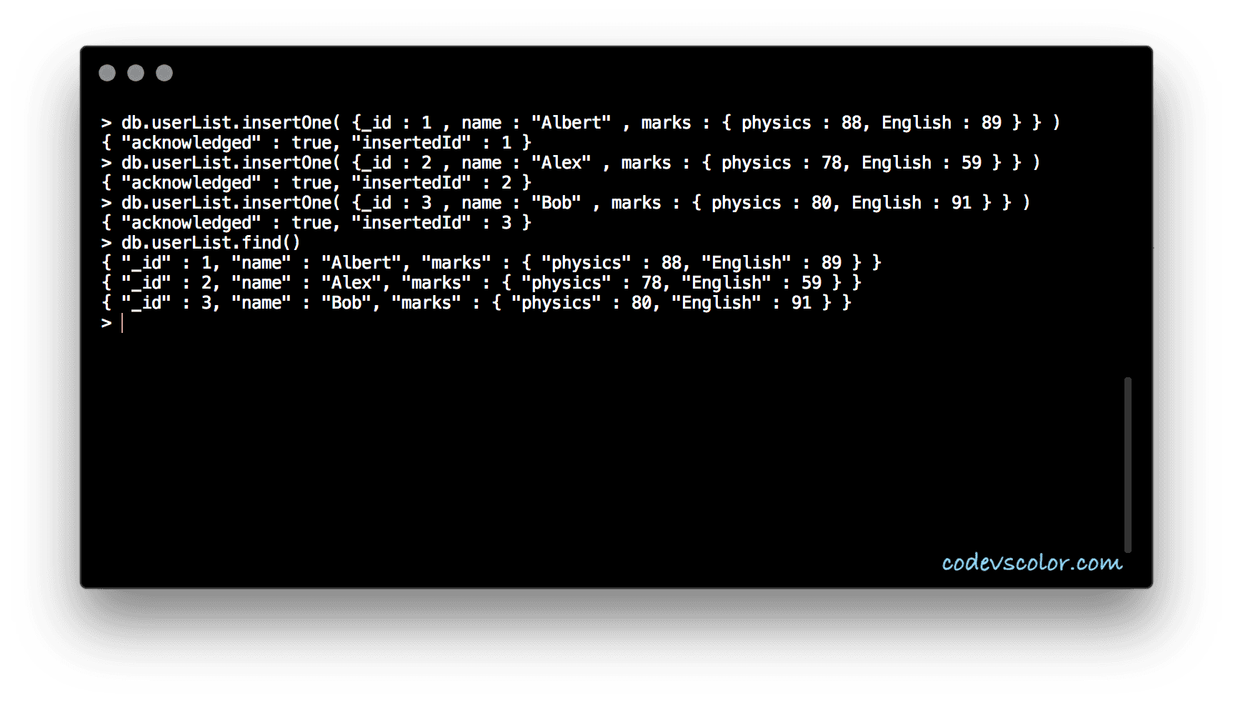> db.userList.insertOne( {_id : 3 , name : "Bob" , marks : { physics : 80, English : 91 } } )