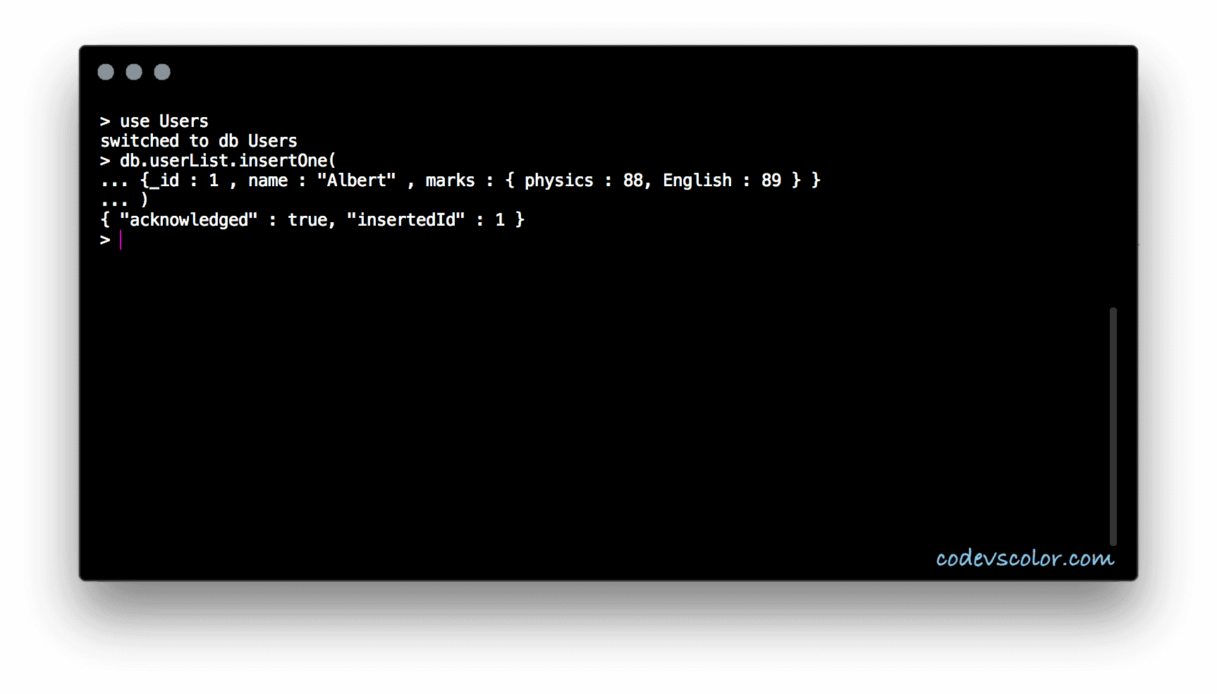 > db.userList.insertOne( {_id : 1 , name : "Albert" , marks : { physics : 88, English : 89 } } )