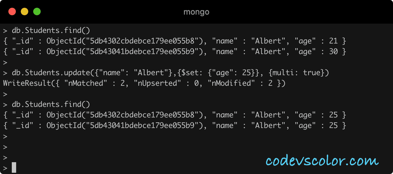 > db.Students.update({"name": "Albert"},{$set: {"age": 25}}, {multi: true})