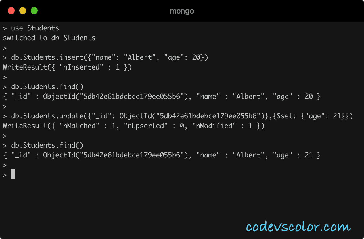 > db.Students.update({"_id": ObjectId("5db42e61bdebce179ee055b6")},{$set: {"age": 21}})