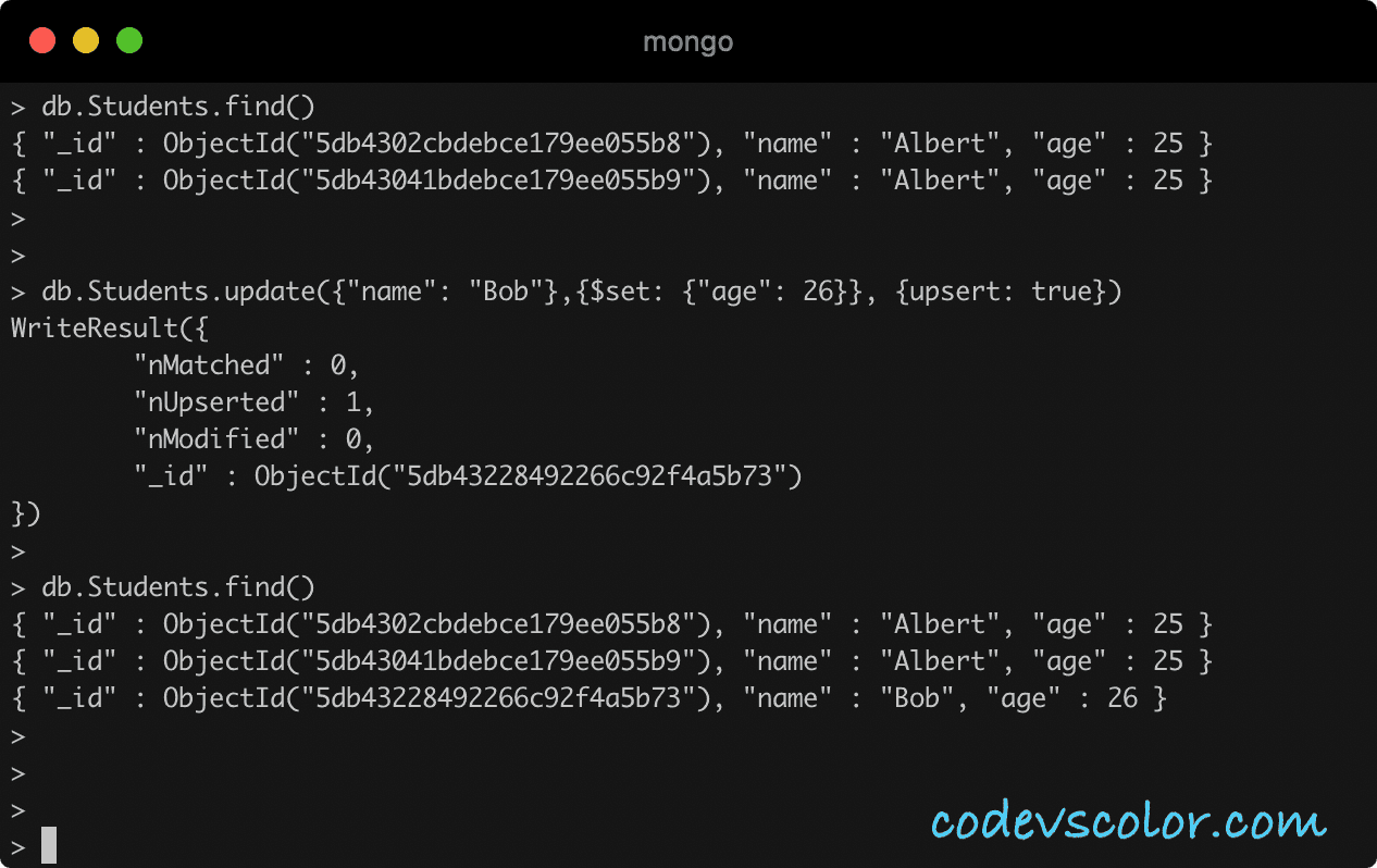 > db.Students.update({"name": "Bob"},{$set: {"age": 26}}, {upsert: true})