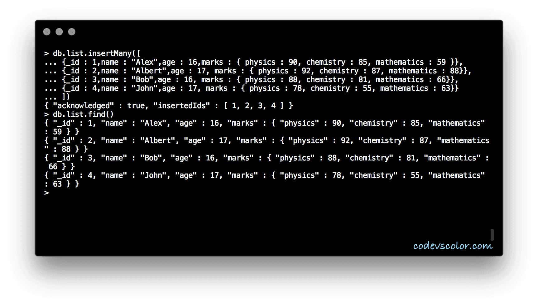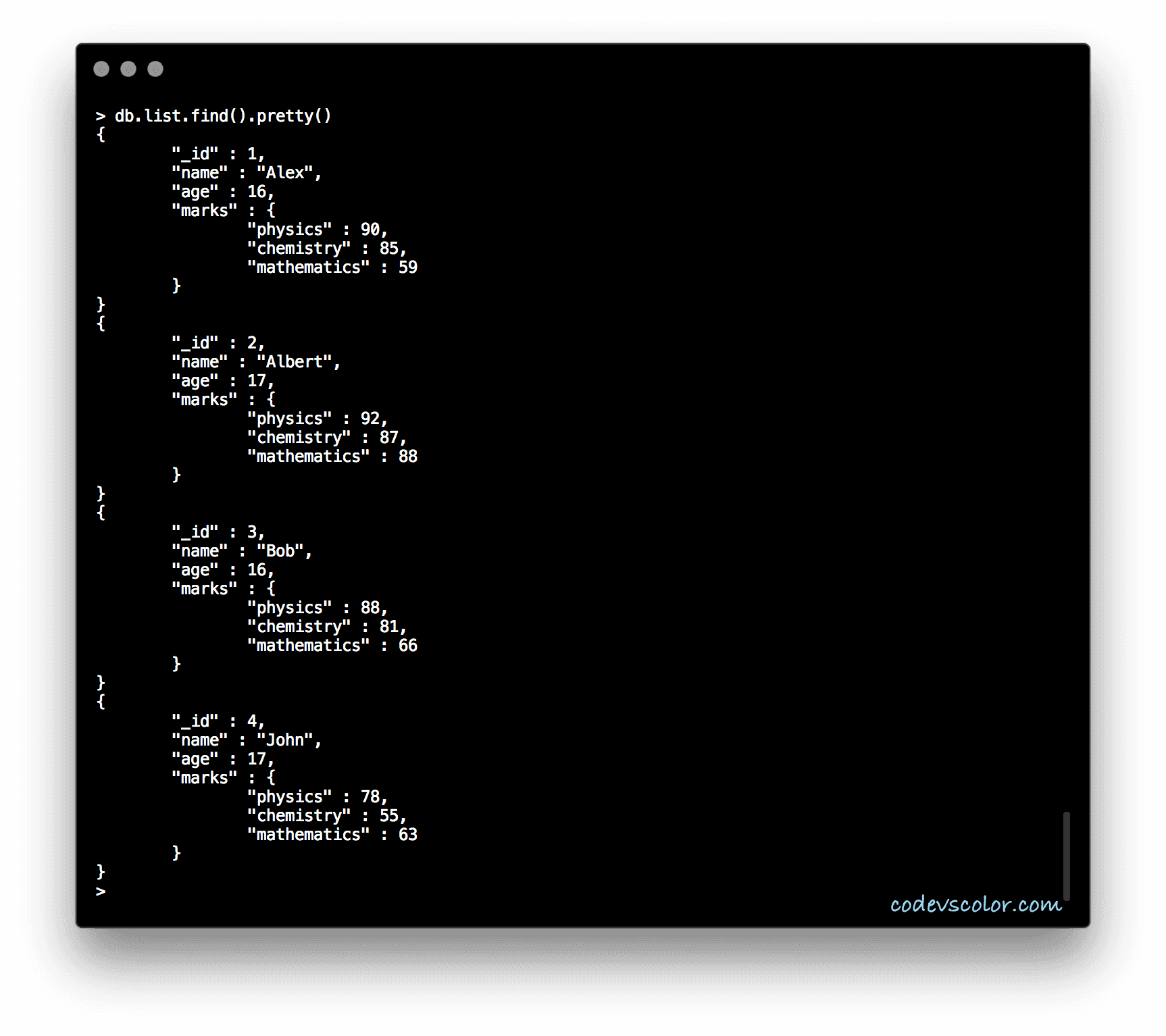 {_id : 1,name : "Alex",age : 16,marks : { physics : 90, chemistry : 85, mathematics : 59 }},