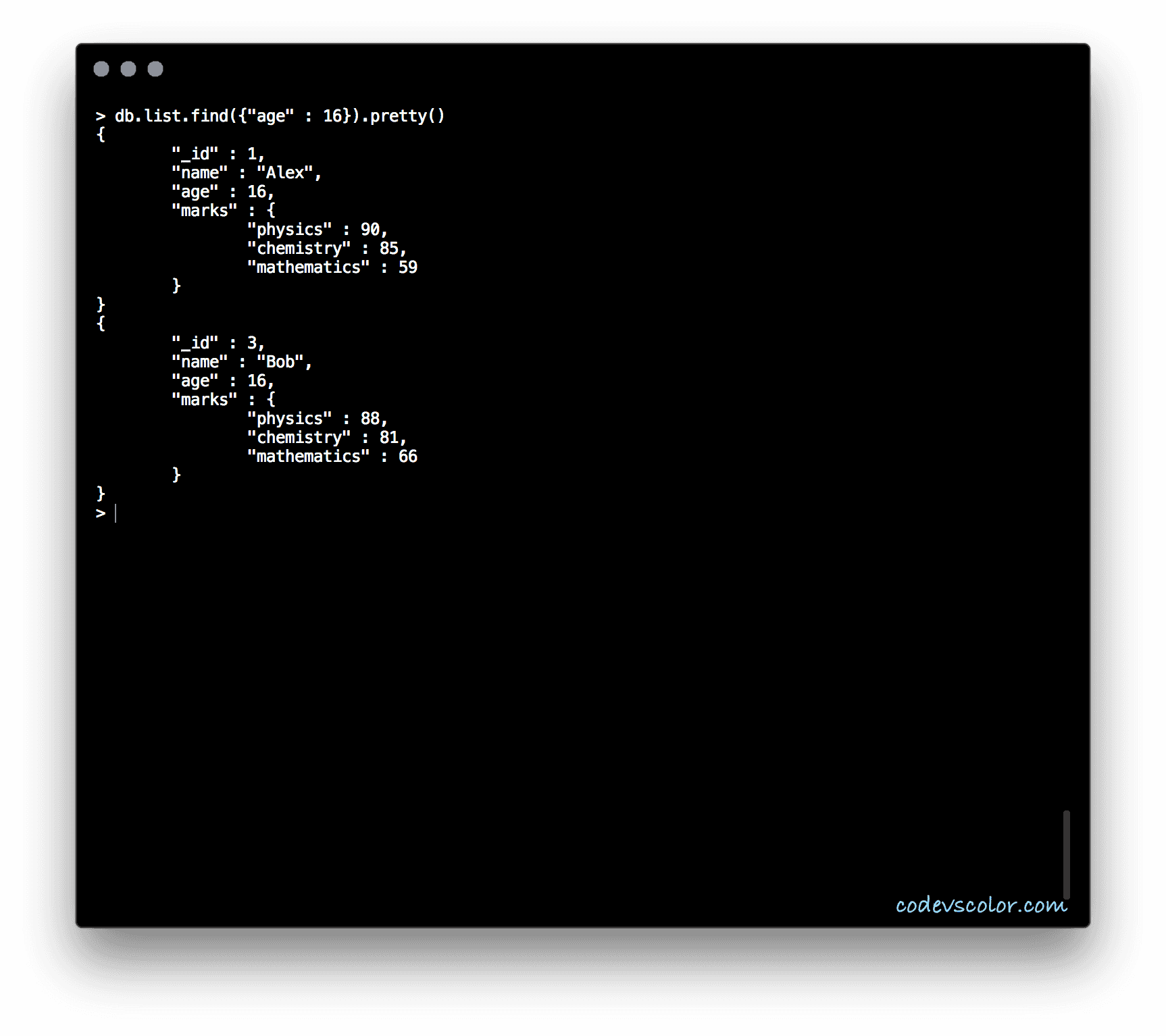 { "_id" : 3, "name" : "Bob", "age" : 16, "marks" : { "physics" : 88, "chemistry" : 81, "mathematics" :
